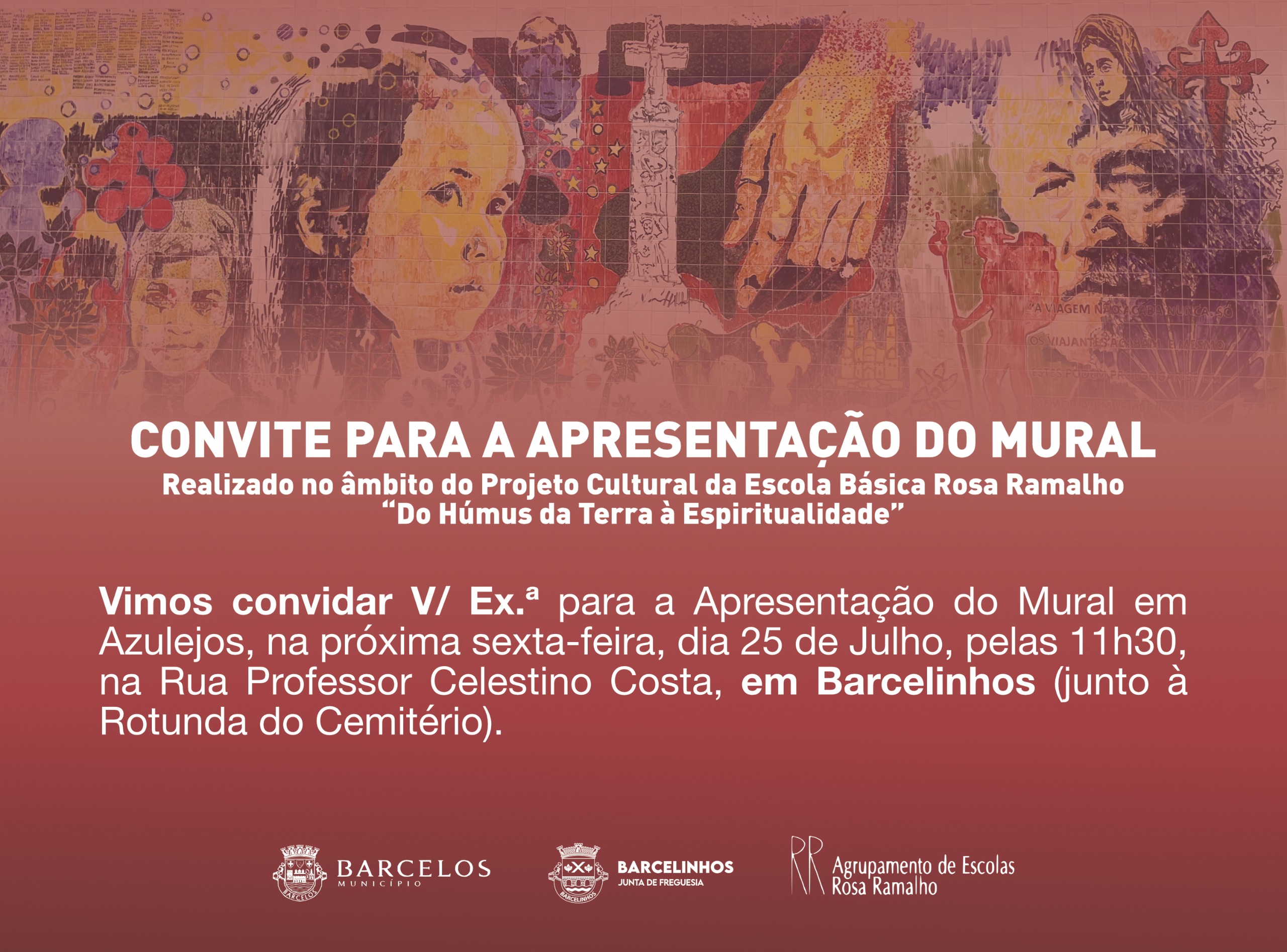 No próximo dia 25 de julho (sexta-feira), pelas 11h30, terá lugar a apresentação oficial do Mural em Azulejos, criado no âmbito do Projeto Cultural da Escola Básica Rosa Ramalho: "Do Húmus da Terra à Espiritualidade".