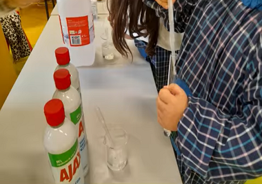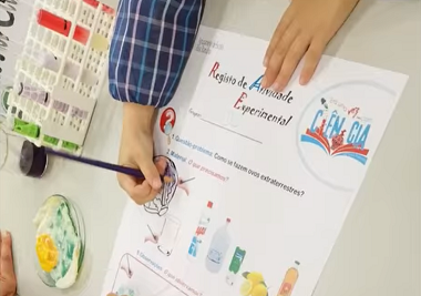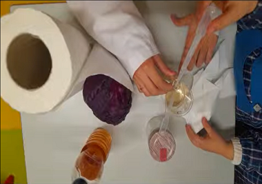 Nesta experiência, os “pequenos cientistas” manipularam pipetas e tubos de ensaio, onde foram colocados, em cada um, os seguintes líquidos: água destilada, sumo de limão, leite, “Ajax” e vinagre. Depois, foi adicionada a cada um destes a água de cozedura de couve-roxa, onde os alunos observaram as alterações de cor que ocorreram, identificando-as. Ficaram encantados!!!!!! Aquando da colocação, através de uma pipeta, de gotas do líquido de cozedura da couve-roxa nos ovos já previamente fritos, a “magia” aconteceu… Os ovos passaram a ser “Ovos Extraterrestres”, como documentamos nas fotografias.